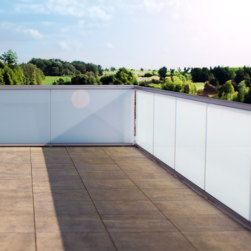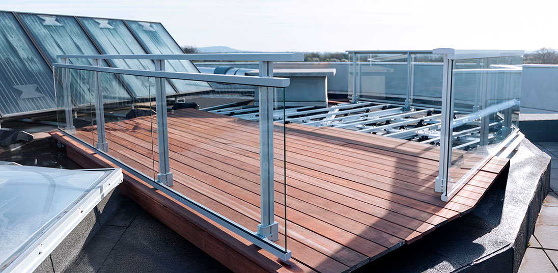 Das neu entwickelte Panorama® Terrassen-Kit umgeht die Probleme, die bei dem Einsatz von fest montierten Geländern an Flachdachterrassen entstehen.
