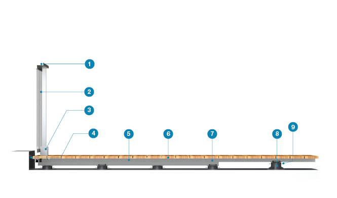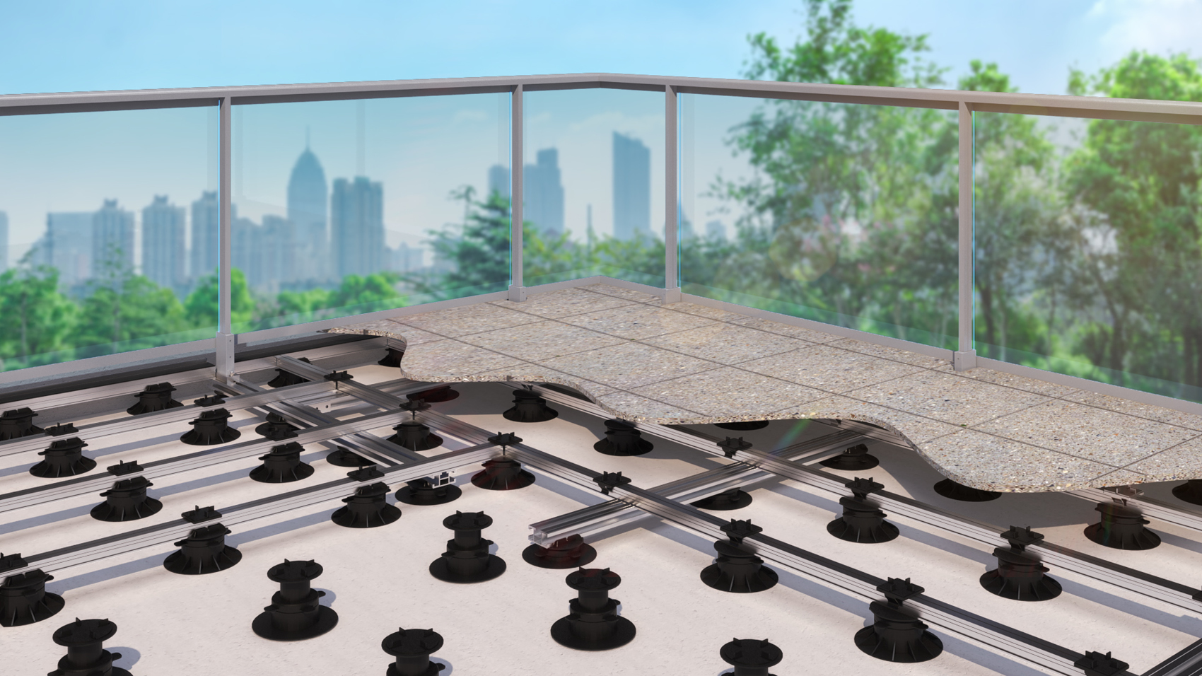 - Das System kann auf einer bestehenden Terrasse nachträglich aufgebaut werden, um diese in eine nutzbare Terrasse umzuwandeln, ohne in den bestehenden Abdichtungskomplex einzugreifen.