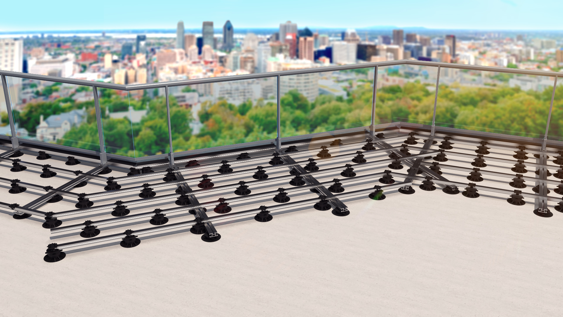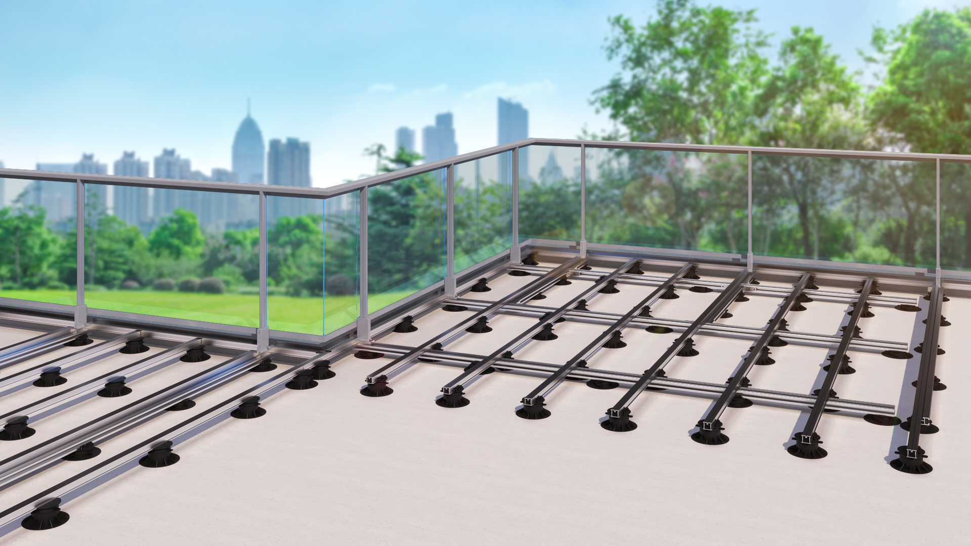 Terrassen-Kit ist die Tragkonstruktion für Platten, Holzdielen oder Fliesen auf Stelzlagern, die gleichzeitig als wirksames Element für die Geländer dient.