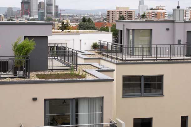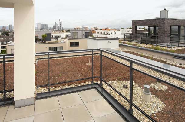 Am Objekt „Goetheblick Special“ der Nassauischen Heimstätte Wohnungs- und Entwicklungsgesellschaft mbH wurden in Frankfurt-Sachsenhausen exklusive Stadtvillen mit Freiterrassen dieser Art geschaffen. „Wir haben uns für das freitragende Geländersystem Panorama® von dani alu entschieden, da wir eine Durchdringung der Abdichtung und die damit verbundenen Nachteile unbedingt vermeiden wollten.“, so Thomas Jeckel, Leiter Neubau technischer Service.
